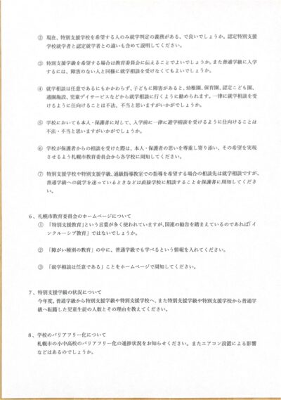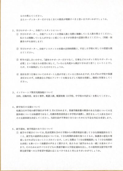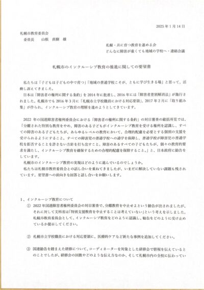 1月14日に、札幌・共に育つ教育を進める会と連名で、札幌市教育委員会に「札幌市のインクルーシブ教育の推進に関しての要望書」を提出しました。